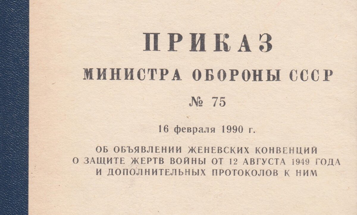 16 февраля 1990 г. Министр обороны СССР подписал приказ № 75 «Об объявлении Женевских конвенций от 12 августа 1949 года и Дополнительных протоколов к ним».