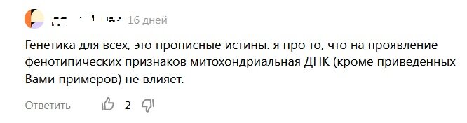 Написала статью про то, что что мать передаёт детям больше наследственной информации, чем отец, потому что только от неё дети получают митохондриальную ДНК. Вот она: И в комментариях к статье увидела вот что: Удивилась. Намекнула комментатору про важность тех функций, что выполняют митохондрии, - всё равно с его стороны непонимание: А там и другие давай с ним соглашаться (почему-то все, никак не понимающие вклада митохондриальной ДНК в фенотип, - это исключительно мужчины. Удивительно... :-) ): К чему я? Вижу назрела необходимость объяснить ситуацию, напомнив читателям о том, какую роль в их "фенотипических признаках" играет-таки митохондриальная ДНК, какой у неё функционал. Напоминаю. Начну с объяснения, почему словосочетание "фенотипические признаки" взяла в кавычки. Да потому, что это тавтология - масло масляное. Смотрите на определение: "Фенотип - совокупность признаков и качеств организма". Вот и получается, что "фенотипический признак" - это признаковый признак. Так за какие же п