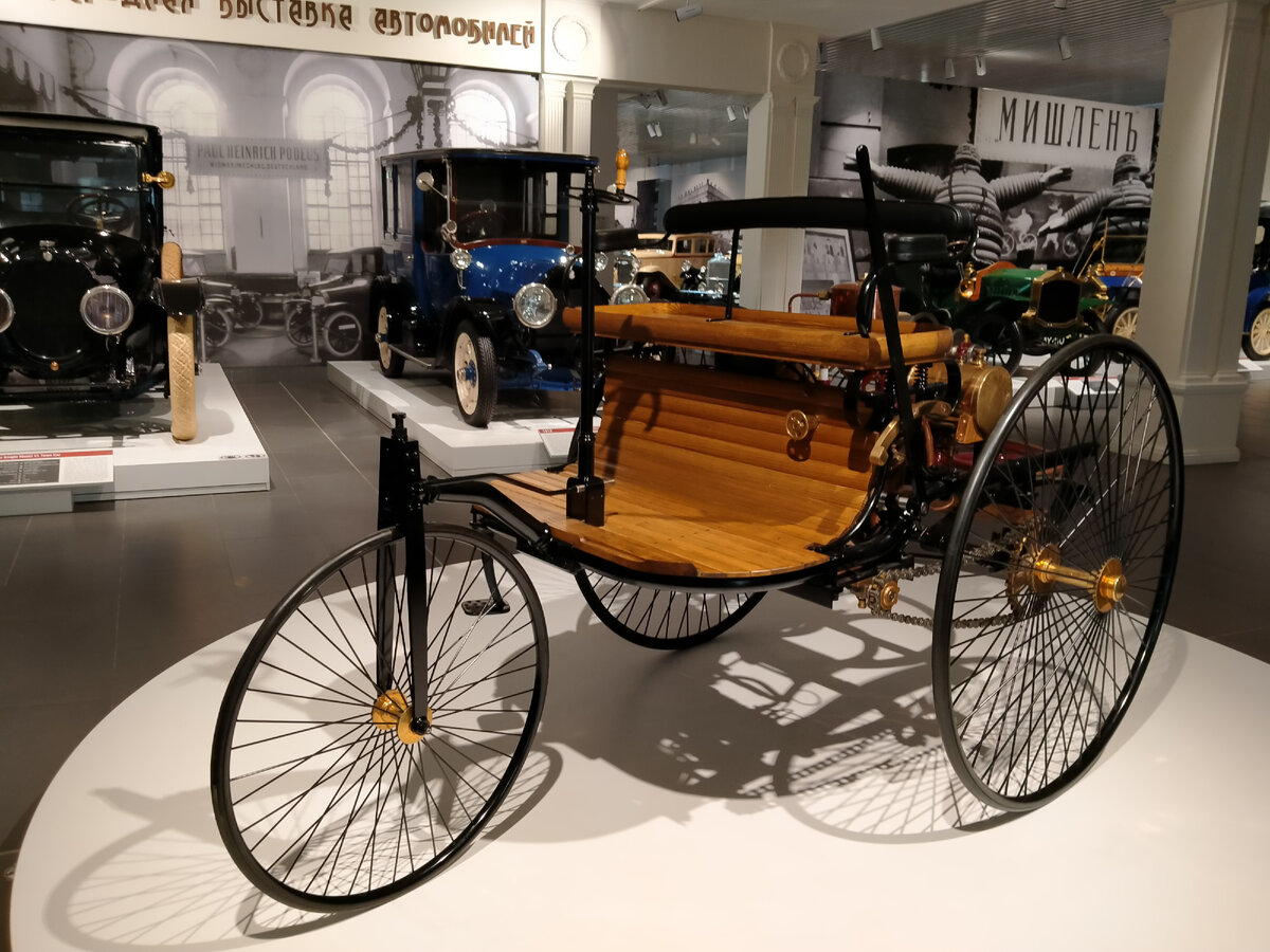 Узнали? Да, это он – первый автомобиль, детище Карла Бенца. Мне кажется, дизайн он подглядел у конкурента, который тоже занимался машинками, у Зингера. Шутка, конечно, но первый автомобиль действительно чем-то смахивает на швейную машинку. Именно этот экспонат открывает удивительную экспозицию музея УГМК, но, вы же понимаете, что это не оригинал… Самый первый автомобиль. Понятно, что самым первым может быть только один. Уникальный и неповторимый. Но по всему миру в разных музеях можно собрать с дюжину самых первых автомобилей Бенца. (Как заметил один учёный, если собрать все святые частички креста, на котором был распят Иисус, то из этих пазлов можно будет собрать с десяток крестов.) Каждому музею хочется иметь в своей экспозиции первый автомобиль. Это логично. С него и следует начинать экскурс в историю. Но это невозможно. Поэтому и создаются реплики, копии, новоделы… Как не назови, суть одна. Но большинство посетителей даже не задаются вопросом, оригинал ли перед ними? Даже если пере