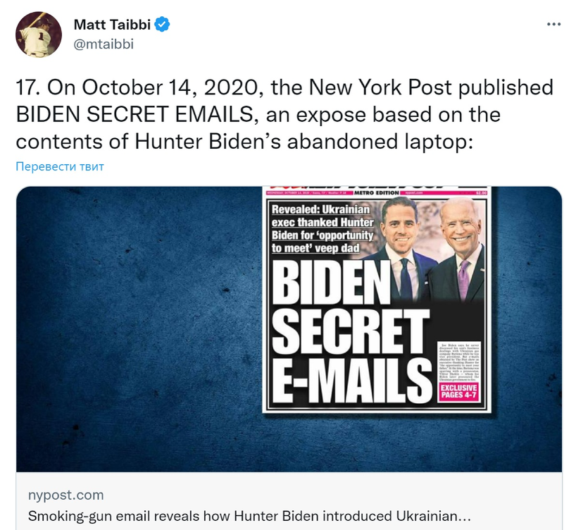 В своем расследовании Мэтт Таибби публикует скриншоты и фотографии переписок. На одном из изображений зафиксировано, как от представителя Демократической партии США в адрес руководства Twitter приходил запрос на удаление нескольких твитов. В следующем посте Таибби показал фото с подтверждением того, что по просьбе политической партии могли быть удалены или просмотрены аккаунты любых пользователей. Наиболее масштабная цензура на ресурсе применялась в октябре 2020 года, когда газета New York Post опубликовала разоблачение сына президента Джо Байдена Хантера, используя информацию, найденную в секретных письмах на ноутбуке родственника главы США. Тогда Twitter удалил все ссылки, опубликованные газетой, и установил на твиты предупреждения о том, что распространенные публикации могут быть небезопасными. Была заблокирована даже передача материалов New York Post напрямую в сообщении — мера для совсем крайних случаев, например при распространении детской порнографии. По словам Мэтта Таибби, сна