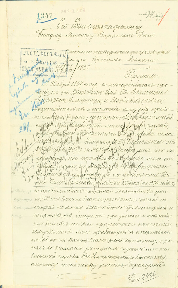 Мой прапрадед Ловицкий Демьян Григорьевич проходил службу унтер-офицером Минского жандармского полицейского управления железных дорог. С ним произошел несчастный случай, попал под поезд и пострадала левая нога. Уже после увольнения со службы он начал писать прошения о назначении ему пенсии от Правительства. По всей видимости безуспешно. Тем не менее этот трагический случай и последовавшая переписка с государственными органами позволила узнать много новых фактов из жизни моего прапрадеда.