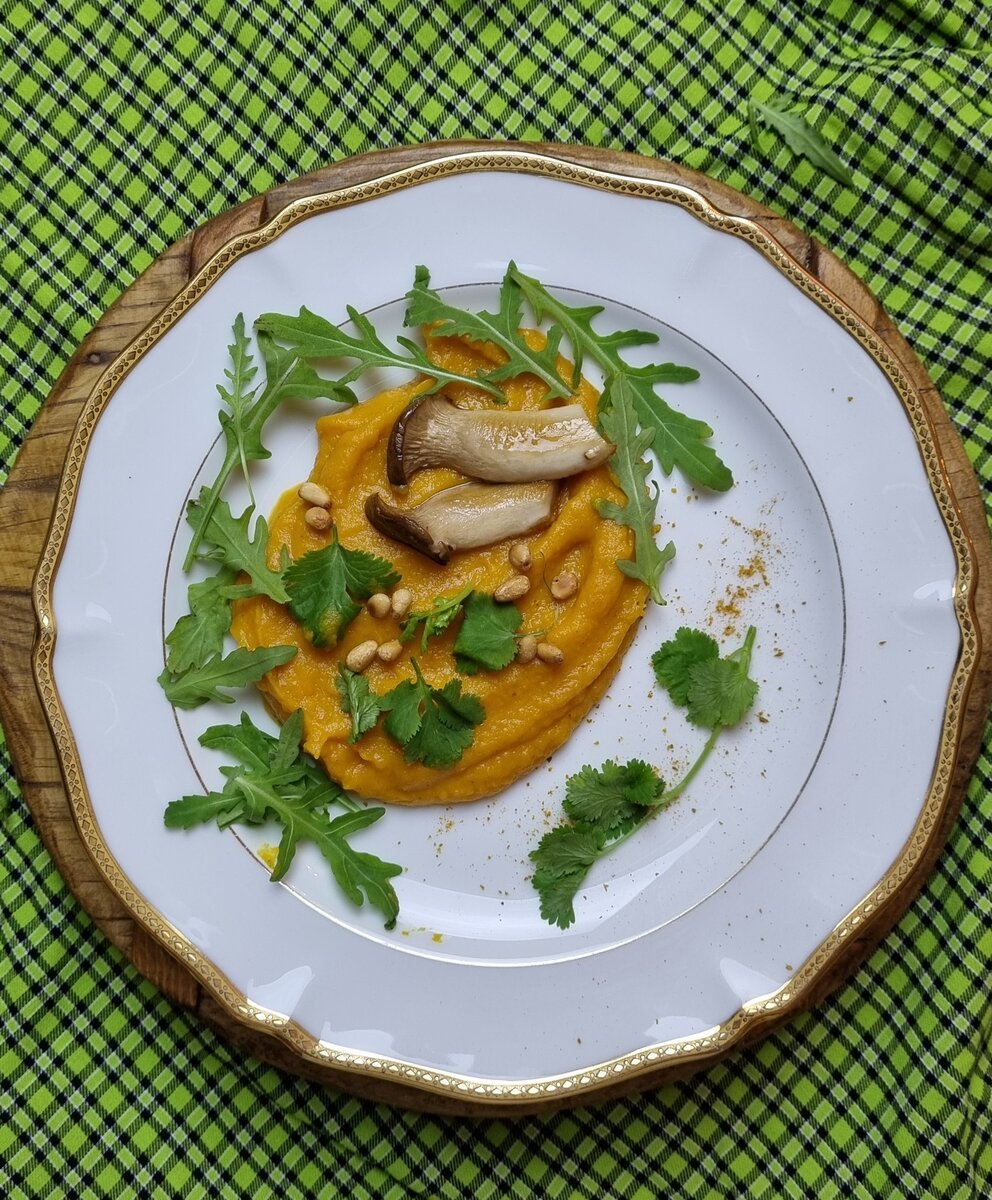 Продолжаем знакомиться с бататом поближе! Ведь он точно этого стоит! И приготовим из него пюре в индийском стиле) Ингредиенты: 1. Батат очистить от кожуры и почистить крупными кубиками. 2. Отварить в кипящей подсоленной воде до готовности (моей хватило 10 минут). 3. Слить из кастрюли воду, добавить кокосовое молоко, карри и пюрировать блендером. 4. Выкладываем на тарелку пюре и украшаем веточками кинзы и слегка обжаренными на сковороде кедровыми орешками. Подаем как самостоятельное блюдо или в качестве гарнира. Кстати, это постный рецепт! А у нас снова быстро, а еще вкусно и красиво - как в ресторане😍. Кстати, кто знает, как называются "хитрые" грибы на фото? Пишите в комментариях.