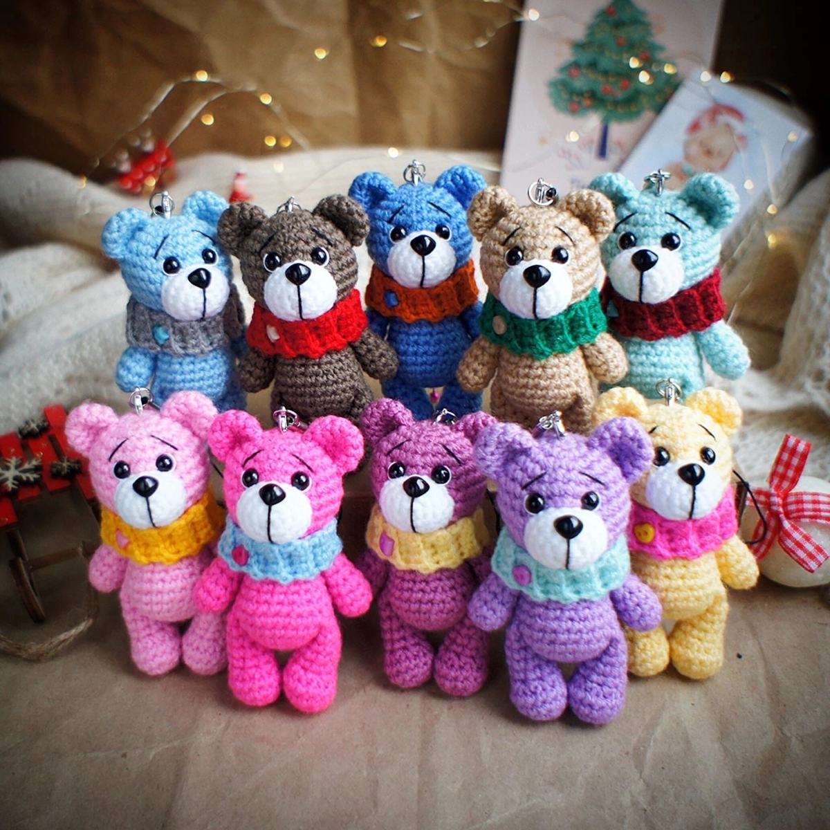 Автор: Вязаные игрушки ♡ gab_toys Друзья, может кто-то захочет себе такие брелочки 🐻⠀ Мишки вяжутся по схеме зайки (голова, тело). Далее описание других деталей ⬇⠀ Мордочка:⠀ 1. 6 сбн в КА⠀ 2. 6 пр [12]⠀ 3. (1 сбн, пр)*6 [18]⠀ 4. 18 сбн⠀ Мордочку пришиваем с 7 по 11 ряд.⠀ Уши:⠀ 1. 6 сбн в КА⠀ 2. 6 пр [12]⠀ 3-4. 12 сбн⠀ Уши пришиваем с 3 по 6 ряд.⠀ Хвост:⠀ 1. 6 сбн в КА⠀ 2. (1 сбн, пр)*3 [9]⠀ 3. 9 сбн ⠀ 4. (1 сбн, уб)*3 [6]⠀ Снуд:⠀ 5 вп, со 2ой петли от крючка 4 сбн;⠀ вп, поворот, 4 сбн за заднюю стенку и т.д. пока не провяжете подходящую длину для вашего мишки.⠀ У меня получается рост-8 см.⠀ Я использую пряжу YarnArt Baby, крючок 2,25.⠀ Глазки 6 мм, носик 6х8 мм. Вяжите с удовольствием и делитесь результатами ❤