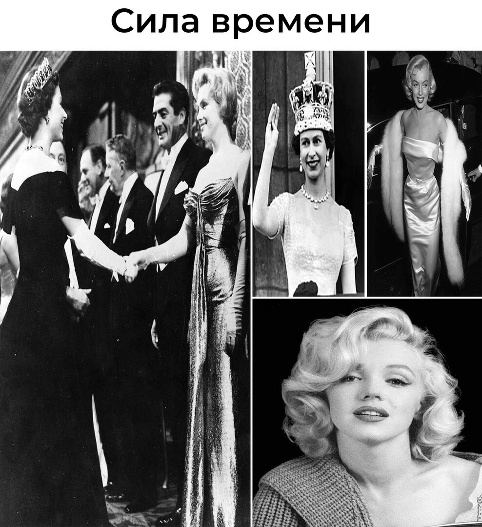 Удивительно, но из-за определённых факторов мы упускаем понимание того, как по-настоящему действует время.. Яркий тому пример это тот факт, что королева Елизавета и Мэрилин Монро являются сверстницами и родились в один год. Удивительно конечно, но это был 1926 год! Мэрилин Монро у нас всегда ассоциировалась с чем-то очень давним и вообще она жила так давно.. Но нет, если бы она не умерла в 1962 году, то выглядела сейчас примерно как королева Елизавета..