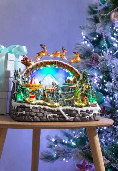 А это "Альпийская деревня" (21х30х34 см). Вверху композиции Санта, летящий на санях с оленями (которых я почему-то обрезала). В магазине цена была 6990 р, но на сайте идет акция - 6440 р, можно немного сэкономить. Композиция выполнена из полирезина. Карусель вращается и дети едут на коньках вокруг ёлки.