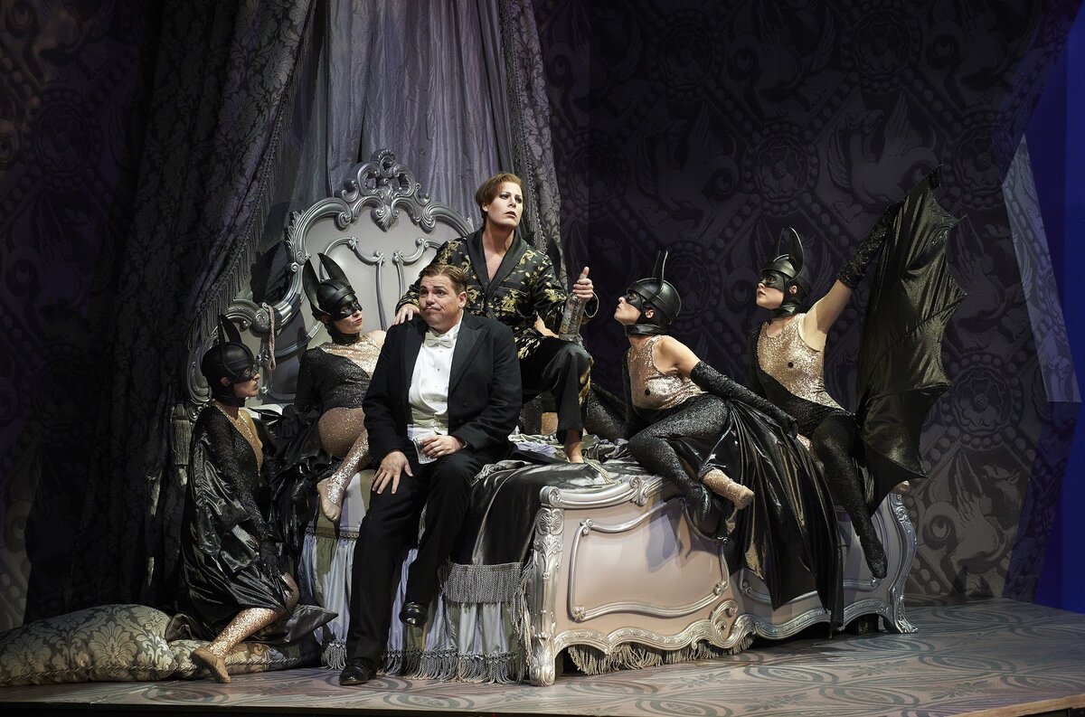 «Летучая мышь», играемая на сцене «Four Seasons Centre» (домашней площадки театра), – тем не менее, работа американца Кристофера Олдена, чьи постановки бывают очень разными по своей эстетике: многие из них весьма провокативны и не раз встречали дружное «бу!» от оперных консерваторов. Но для Торонто Олден делает просто красивый спектакль: те элементы шутовства и буффонады на грани приличий, что он всё-таки привносит в оперетту, никого не способны оскорбить, а воспринимаются с юмором и вызывают естественную реакцию публики – задорный смех. В наибольшей степени Олден покуражился, разумеется, в сцене бала у князя Орловского: тут и «страшные» летучие мышки в масках из балетного окружения Иды, сестры Адели, и полный набор трансгендеров в нелепых, карнавальных одеяниях, включая директора тюрьмы достопочтенного герра Франка. У постановки три визуальных доминанты (сценограф Аллен Мойер): это карманные часы циклопических размеров, мерно раскачивающиеся уже на звуках прекрасной увертюры на фоне ещё закрытого занавеса, это гигантская изогнутая многофункциональная лестница, и, наконец, супружеский альков Айзенштайнов под роскошным балдахином, намертво приколоченный к авансцене, по причине чего оказывающийся и на балу Орловского – на этом мягком ложе русский богатей распивает беленькую, а главный сердцеед оперетты Габриель Айзенштайн кокетничает со всеми дамами высокопоставленной вечеринки. Демиург всей фабулы, желчный доктор Фальке ещё к тому же и гипнотизёр – по крайней мере, дамы абсолютно реагируют на его пассы, благодаря чему режиссёр имеет возможность моментальной смены мизансцен: Фальке «выключает» из действия одних героев (чаще героинь), и «вводит» в него других.