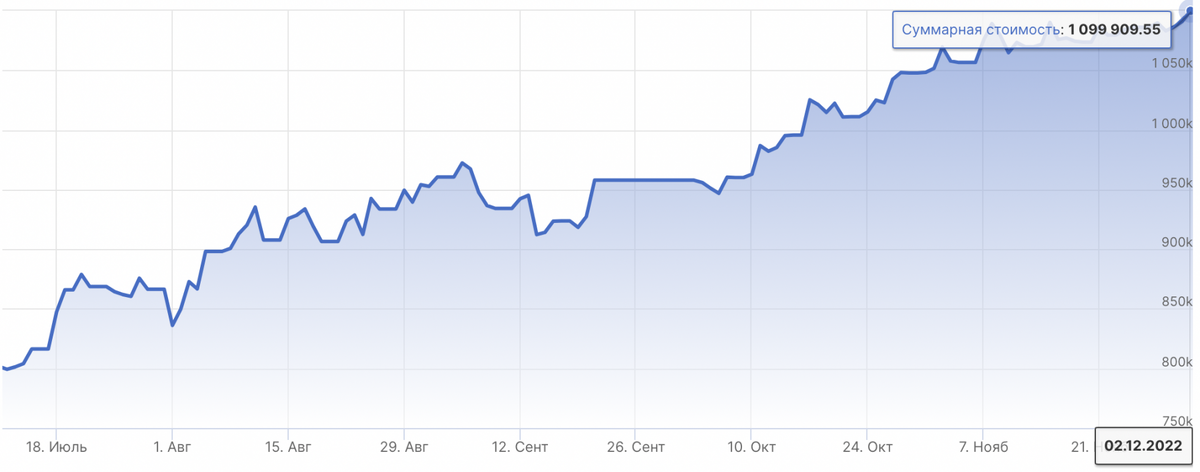 В конце каждой недели мы подводим промежуточные итоги и делимся результатами: 11 июля 2022 г. - 800 000 руб. 2 декабря 2022 г. - 1 099 539,55 руб. Доходность портфеля: +37,5% Индекс Московской биржи: -1,89% Глобально российский фондовый рынок находится в нисходящем тренде, локально – сейчас мы наблюдаем попытки выхода из боковика вниз. По многим акциям на этой неделе цены оттолкнулись от уровней сопротивления и вышли из зоны консолидации. После сильных данных по рынку труда в США доллар начал укрепляться в ожидании дальнейшего повышения процентных ставок. В итоге сырьевые товары, номинированные в долларах, пошли вниз, что в свою очередь оказало дополнительное давление на российский рынок. В результате, индекс Московской биржи за неделю снизился на -0,67%. Тем временем, наш портфель Finrange NEW за неделю прибавил +1,22% за счёт открытия коротких позиций. Мы продолжаем откровенно делиться результатами и рассказывать честно о наших успехах и неудачах. Хотите зарабатывать вместе с нами и