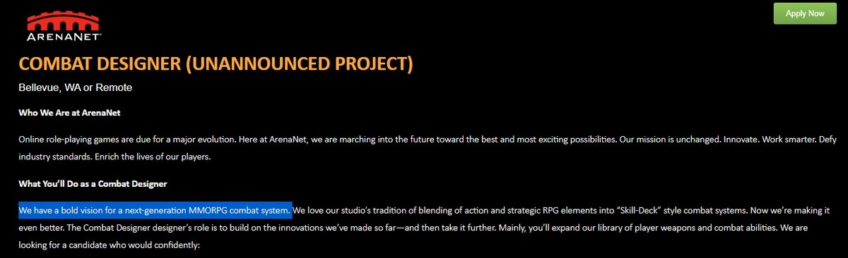 ArenaNet на своем официальном сайте разместила вакансию дизайнера боевой системы для неанонсированного проекта. У нас есть смелое видение боевой системы MMORPG нового поколения. Нам нравится традиция нашей студии сочетать элементы экшена и стратегической RPG в боевых системах в стиле "Skill-Deck". Теперь мы хотим сделать ее еще лучше. Роль дизайнера боевой системы заключается в том, чтобы развивать инновации, которые мы сделали до этого момента, а затем продвигать их дальше. В основном вы будете расширять нашу библиотеку оружия и боевых способностей игроков. Формулировка объявления странная: оно указано как "неанонсированный проект", но в тексте прямо говорится: "Вы расширите нашу библиотеку оружия и боевых способностей игроков", что звучит так, будто это что-то для Guild Wars 2. Возможно, разработчики ищут кого-то для следующего расширения, чтобы поработать над боевой системой игры, поскольку это расширение технически является неанонсированным, так как мы не знаем о нем ничего, кроме