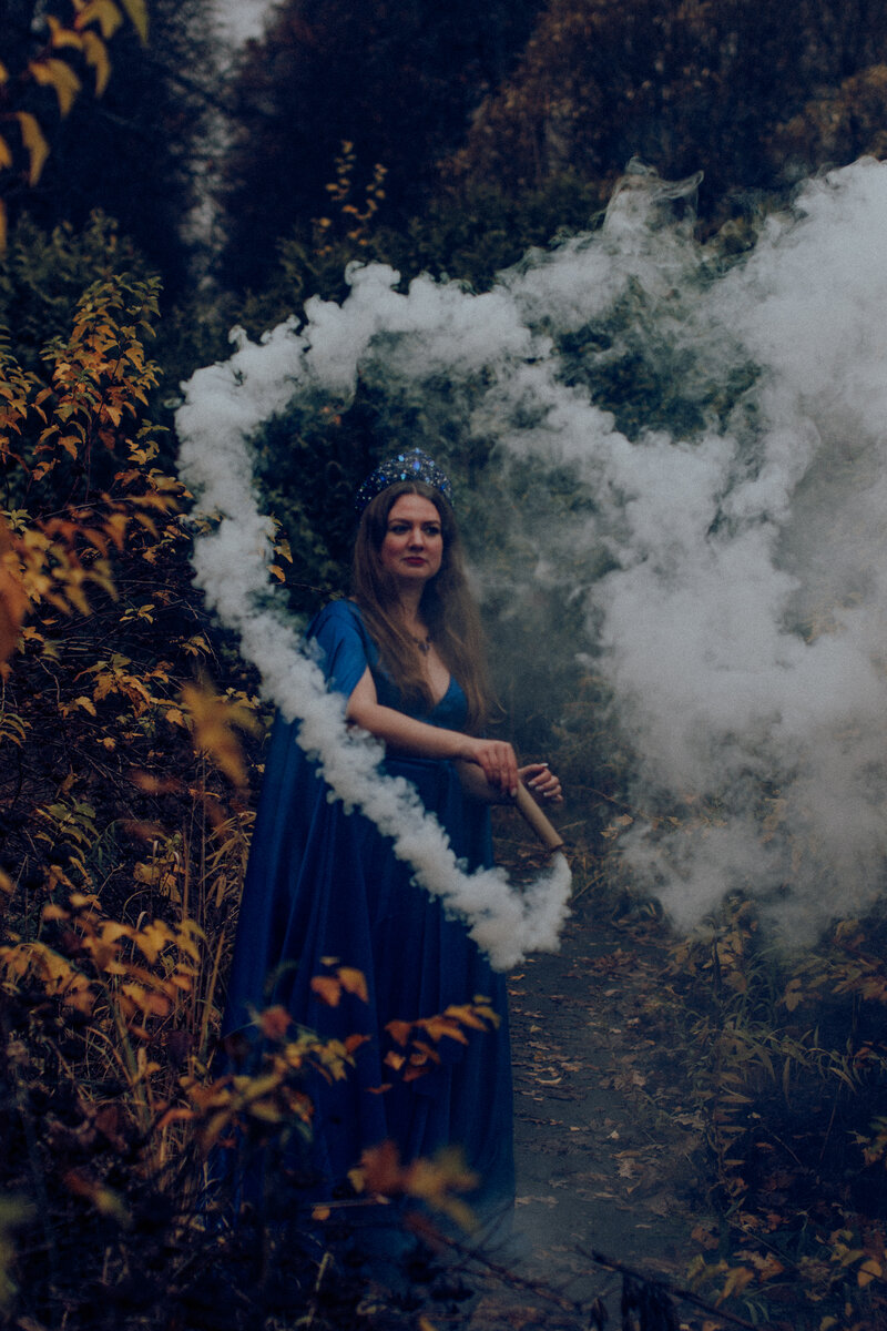 Мы с Татьяной вместе проработали вообще всё: Нашли заброшенную усадьбу (правда думали, что она не заколочена), купили цветной дым, нашли где арендовать на пару дней офигенное платье, даже подумали над деталями, и взяли с собой ожерелье и фонарик со свечкой.