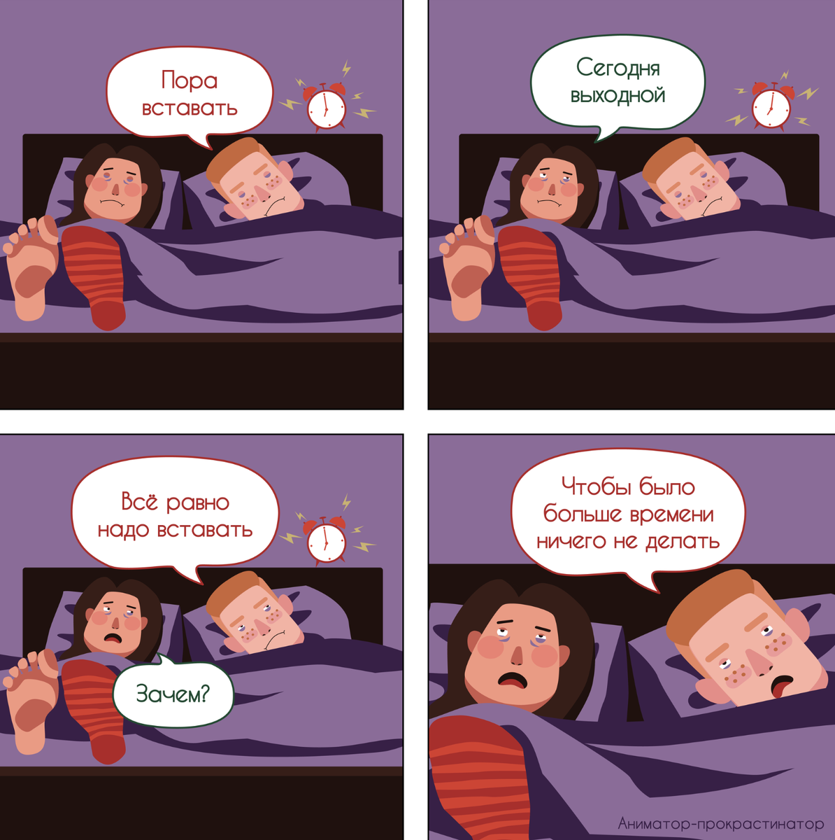 Привет, дорогой друг! Раньше, когда я работал в найме, я всегда с нетерпением ждал выходные. Наверное, все фрилансеры, читая этот пост охнут: «Как ужасно терпеть будни в офисе ради субботы и воскресенья». Не беспокойтесь, все было не так плохо! У меня были и любимые рабочие дни – дни зарплаты). Сейчас я могу устроить себе выходной в любой день, но, честно говоря, я уже давно не уходил в отрыв. Видимо, чем ценнее выходной – тем больше его хочется провести на максимум. Однако есть те, кто предпочитает проваляться субботу и воскресенье в кровати. Сегодня я подготовил для вас подборку комиксов про идеальные выходные. У каждого они свои) Проснуться по будильнику в будний день – ох, как непросто! А вот встать в 8 утра в субботу – вообще не проблема. Ведь нас ждет так много интересного и приятного впереди! Художница Алена Халимончук считает, что вставать пораньше в выходные нужно для единственного, но исключительно важного дела. Любимые питомцы тоже ждут окончания нашей рабочей недели, чтобы