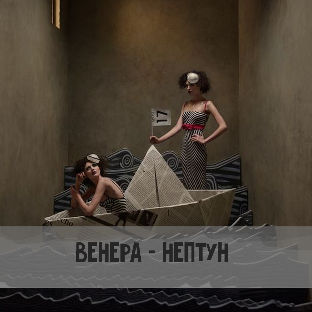 Венера в аспекте с Нептуном (также относится к Венере в Рыбах или Венере в 12 доме) дает мечтательную любовь. Венера - Нептун фантазирует о любви и способна на время создать рай на земле (в отношениях). Здесь есть изобилие веры и отвращение к реальности. Они не видят свою любовь или любимого как кого-то приземленного или настоящего (реального). Их любовь неземная, мечтательная, чистая и, всегда привлекательная. Венера - Нептун дразнит Однако такие отношения можно удерживать до тех пор, пока завеса не опустится. Причем это неизбежно, потому что это заблуждение, и самообман, и действительно, очень великая, но не настоящая любовь. Такие люди звонят нам, чтобы рассказать, что встретили идеального мужчину/женщину своей мечты. Причем вы уже слышали это раньше, поскольку предыдущее знакомство тоже было вау. Они поклоняются возлюбленным и проецируют на них сверхчеловеческие качества, одновременно игнорируя и стирая любые признаки того, что возлюбленный = несовершенный человек. Однако есть вари