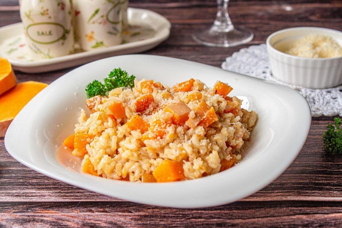 Тыквенно-сырное ризотто ИНГРЕДИЕНТЫ 800 мл овощного бульона 300 г мякоти тыквы 170 г риса арборио 150 г плавленого сыра Дружба «Карат» 1 репчатая луковица 80 мл белого вина 2 ст.л. растительного масла 1 веточка розмарина соль молотый черный перец Мякоть тыквы нарежьте кубиками и выложите в сотейник. Добавьте бульон и оставьте варится 10 мин. Пробейте блендером. Лук мелко нарежьте. Разогрейте сковороду с растительным маслом. Выложите лук и жарьте 2-3 мин до появления аромата. Добавьте рис и готовьте 5 мин. В сковороду добавьте вино и готовьте на сильном огне, пока большая часть жидкости не выпарится. Порциями добавляйте к рису бульон, и готовьте, помешивая, пока жидкость полностью не выпарится. Снимите с огня и добавьте в ризотто сыр, приправьте солью и перцем по вкусу, перемешайте. Подавайте, украсив свежим розмарином, обжаренными кусочками тыквы и перцем.