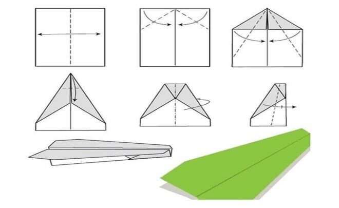 КАК СДЕЛАТЬ САМОЛЕТ ИЗ БУМАГИ? 7 ПРОСТЫХ СХЕМ Кто не конструировал в детские годы бумажные поделки? Прыгучие жабки, кораблики, самолетики и по сей день в арсенале школьников и малышей. Поделки из самого доступного материала это не только увлекательное развлечение, но и отличный способ развить мелкую моторику, пространственное мышление и воображение детей. Почему бы и взрослым не восстановить в памяти, как сделать самолет из бумаги и научить этому мастерству своих детишек? Вы удивитесь, какими «крутыми» могут быть летательные аппараты. Базовые модели самолетиков Чтобы сделать самолет из бумаги своими руками и вспомнить азы, знакомые с детства, начните с самых простых моделей. Для конструирования оригами потребуется всего лишь листок прямоугольного формата и немного сноровки. Выбирайте бумагу средней плотности, которая хорошо держит форму и легко складывается. Самый простой вариант Классический дальнобойщик Рекомендуем сделать из бумаги самолет, который летает подобно бумерангу. Супер са