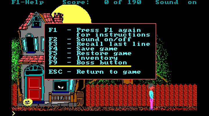 Изначальная дата публикации: 23 ноября 2016 В Hugo's House Of Horrors (в том числе и в остальных играх серии) существует некая кнопка босса. В первой части прохождения этой игры я упоминал эту кнопку, но тогда ещё не знал, что она означает. И теперь я расскажу вам, друзья, что она, собственно, делает! Если вы нажмёте на F9 во время игры, игра выключится, и вы увидите экран DOSBox-а. Однако, вы увидите там команду: C:\Hugo, с помощью которой можете сразу запустить игру снова, при этом не монтируя диск и вообще не набирать те команды, через которые вы обычно запускаете игру. Процитирую разработчика этой серии игр Дэвида Грэя (David P. Gray) из руководства пользователя: So-named because it instantly removes all traces of the game from the screen and places you in a normal DOS environment from which you can perform your regular work-like commands. Note, however, that the game is still lurking unseen in the background and the amount of memory available to you is reduced by about 280Kb. Эта