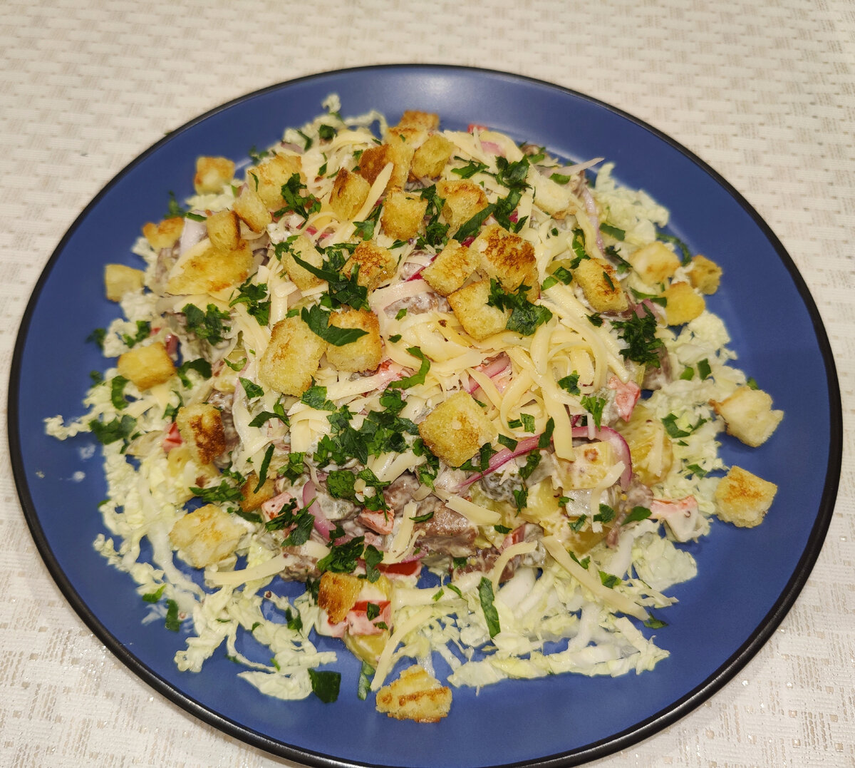Последний штрих - выкладываем сухарики и украшаем салат петрушкой.