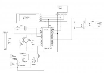 В сети достаточно много уже писалось по данной теме, в том числе и на cxem.net, однако я все же решил создать свое устройство детектирования радиации. Основной задачей было максимально упростить и удешевить конструкцию, сделать ее доступной для повторения начинающим радиолюбителям. Представленная ниже схема не содержит дорогих деталей и намоточных элементов, типа трансформаторов, а катушка индуктивности из стандартного ряда. Схема позволяет использовать практически любые трубки Гейгера типа СТС-5, СБМ-20 и т.п. с рабочим напряжением около 400 вольт. Кроме замера уровня радиации, устройство позволяет измерять температуру и влажность окружающей среды. Схема дозиметра приведена ниже: Питание дозиметра осуществляется от литиевого АКБ 18650 через повышающий DC-DC преобразователь, который является одновременно и платой зарядки. Перед подключением основной схемы к питанию, следует установить напряжение на выходе преобразователя +5 вольт! Так как в схеме применяется контроль заряда АКБ, то под