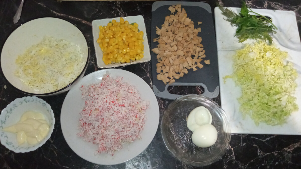 Всем привет Дорогие друзья ❤️. Сегодня в моей копилочке Новогодних рецептов - салат🎅🍾. И не просто салат, а мой самый любимый. Я очень часто готовлю его на праздники. Он получается очень нежный, вкусный. И гости его съедают в первую очередь ❄️🥂. Для этого нам понадобится: 🔸Яйца- 3 шт 🔸Крабовые палочки - 1 упаковка 220 гр 🔸Кальмар свежий или маринованный в собственном соку - 180 гр 🔸 Кукуруза консервированная- 150 гр 🔸Пекинская капуста- 50 гр 🔸Зелень- 10 гр 🔸 Майонез - 100 гр. У меня Махеев салатный 370 ккал! На фото видно, что я крабовые палочки и яйца натерла на тёрку. Кальмары мелко порезала. Если у вас сырой кальмар, его нужно отварить. От трёх яиц оставила белок для украшения Новогоднего салата. Самый простой способ это просто все порезать и перемешать с майонезом. Но у нас Новый год и я буду делать красивый салат слоями❤️🎅 Для этого застилает салатницу пищевой плёнкой. 🎄Первый слой - яйца, затем крабовые палочки. Ложкой плотно утрамбовываем каждый слой. 🎄 Далее тонкий