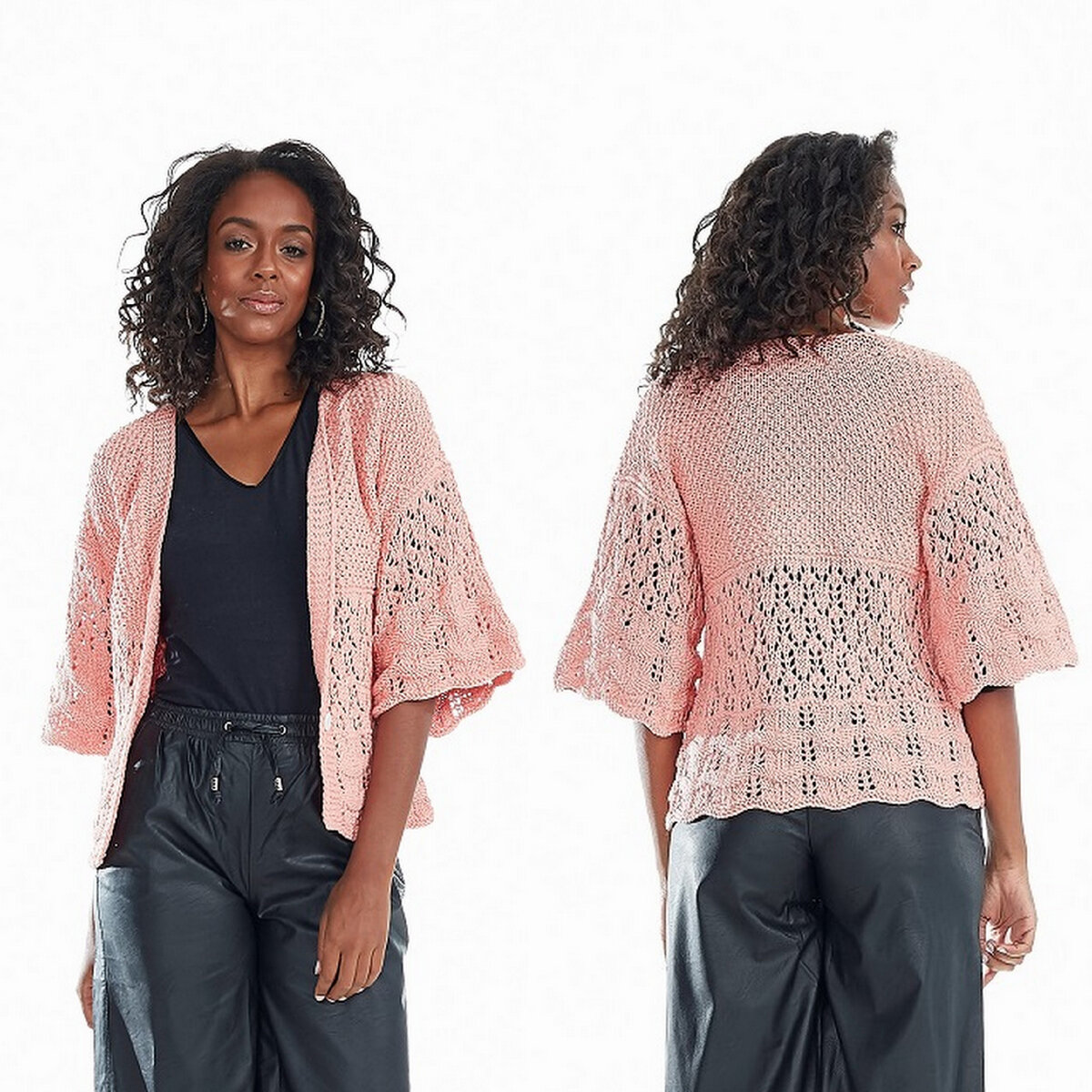 Нежный розовый кардиган с широкими рукавами до локтя. Женственная модель на пуговичках, с несложными ажурными узорами спицами.