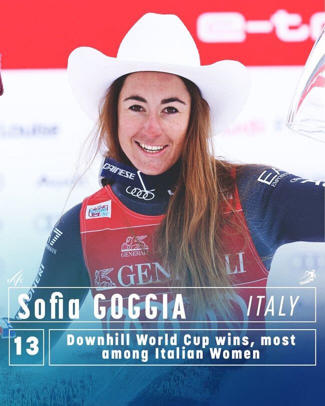 Вчера София Годжа одержала 13-ю победу в скоростном спуске и по этому показателю вышла на первое место среди итальянок. Она также стремительно приближается к впечатляющему результату Федерики Бриньоне, которая за свою карьеру уже одержала 20 побед на этапах Кубка мира. Сейчас у Софии – 18 побед, и, возможно, сегодня прибавится еще одна.