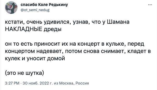 Накануне в соцсетях начали распространять информацию, что знаменитые дреды SHAMANа, которые являются частью его узнаваемого образа – не настоящие. Мол, перед каждым концертом артист надевает их, а потом снова снимает. Певец решил делом опровергнуть этот фейк. SHAMAN пообщался с журналистами после выступления на фестивале «Песня года». Один из вопросов был как раз про его «накладные» дреды. Ярослав решил опровергнуть слух и разрешил журналистке потрогать его за волосы. Сначала девушка аккуратно потянула за дреды, но певец настоял, чтобы она приложила больше усилий. «Скажут, что оттаскала вас за волосы», — посмеялась журналистка. На фоне резко возросшей популярности SHAMANа многие россияне задаются вопросом об искренности артиста. Его недавнее интервью только подтвердило эти сомнения.