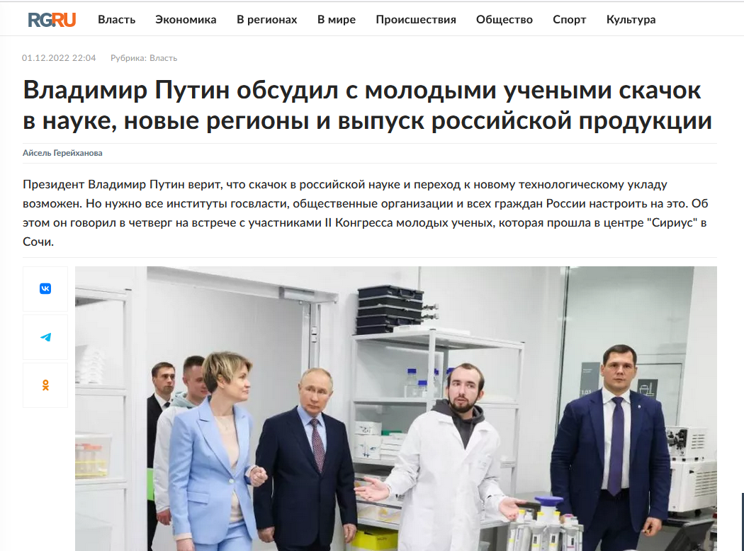 Как пишет официальное издание правительства РФ "Российская газета", Путин "верит, что скачок в российской науке и переход к новому технологическому укладу возможен. Но нужно все институты госвласти, общественные организации и всех граждан России настроить на это".