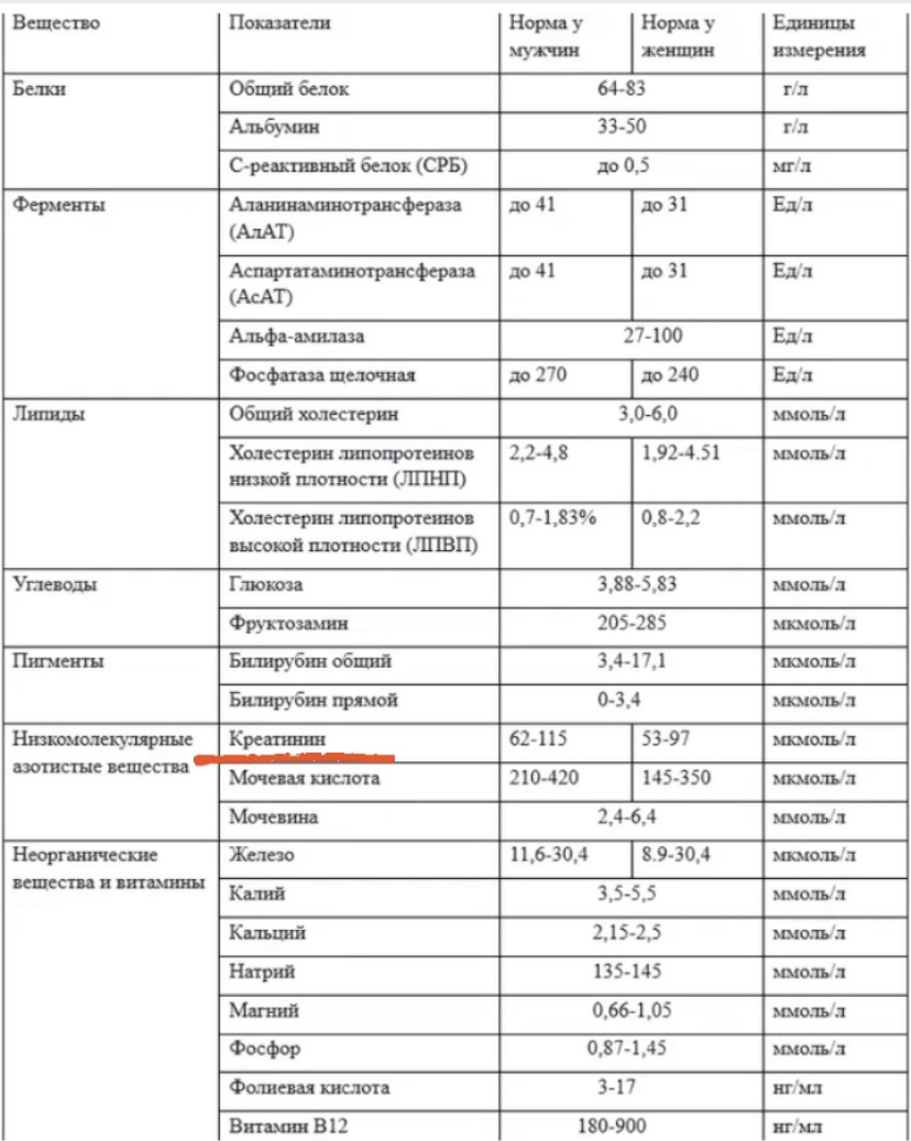 🥼Для чего исследуют креатинин? ▫️Одним из важных показателей функции почек является концентрация в крови креатинина (конечного звена распада белковых тканей). ▫️Уровень креатинина в сыворотке крови используют в качестве маркера скорости клубочковой фильтрации (СКФ) в почках – в диагностике острых и хронических нарушений функции почек; для оценки функции почек при принятии решений о дозировке лекарственных препаратов, выводимых почками, или перед применением препаратов, которые могут оказать неблагоприятное воздействие на почки. ✔️Норма креатинина в крови Для взрослых мужчин от 0,74 до 1,35 мг/дл (от 65,4 до 119,3 мкмоль/л) Для взрослых женщин от 0,59 до 1,04 мг/дл (от 52,2 до 91,9 мкмоль/л) ▫️При сдаче анализа обязательно: 1. За 2 суток до анализа отменить занятия в спортзале и ограничить белковую пищу. 2. За сутки исключить спиртное, крепкий кофе и чай. 3. Ужинать накануне теста до 19 часов, не переедать. 4. Утром не курить, можно выпить воду. ▫️Симптомы, указывающие на откло