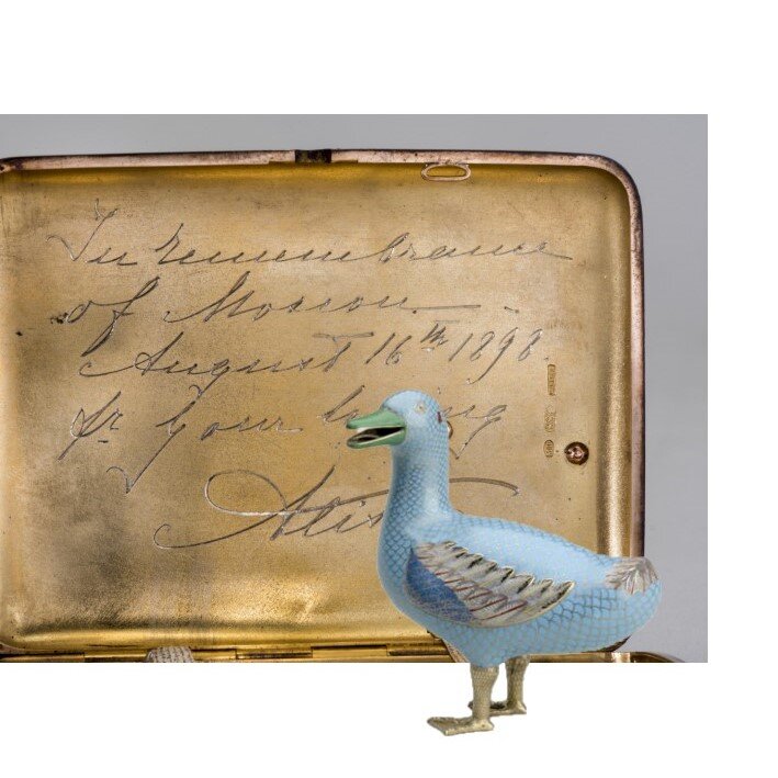 Портсигар с миниатюрными портретами великих княжон Ольги Николаевны и Татьяны Николаевны. Как видно, на изделии нанесена факсимильная гравировка, гласящая: «В память о Москве / 16 августа 1898 / от твоей любящей / Аликс» (в оригинале – на английском языке) посвящена визиту императорской четы с детьми в Москву по случаю открытия памятника Александру II в Кремле.