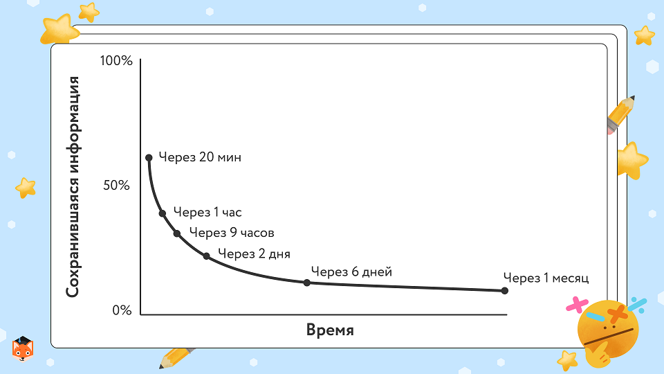 В конце XIX века немецкий психолог Герман Эббингауз сформулировал концепцию «кривой забывания» в монографии «Память». Он проводил опыты на себе и студентах: нужно было заучить бессмысленные слоги, используя разные техники запоминания. Сам Эббингауз фиксировал время и наблюдал, как скоро испытуемые забудут эту информацию. Оказалось, что после первых 20 минут студенты помнили 60% слогов, спустя девять часов — 40%, а через месяц — чуть больше 20% заученного. Эта зависимость получила название кривой забывания Эббингауза. Учёный провёл второй эксперимент для сравнения результатов. На этот раз нужно было заучивать не бессмысленные слоги, а связный текст «Дон Жуана» Байрона, равный по объёму. Результат оказался примерно таким же — со временем удавалось воспроизводить меньшее количество информации. Именно поэтому даже отличники за лето порой забывают программу прошлого класса. В 2015 году нидерландские учёные Джаап Мурр и Джори Дрос подтвердили концепцию Эббингауза. Но как