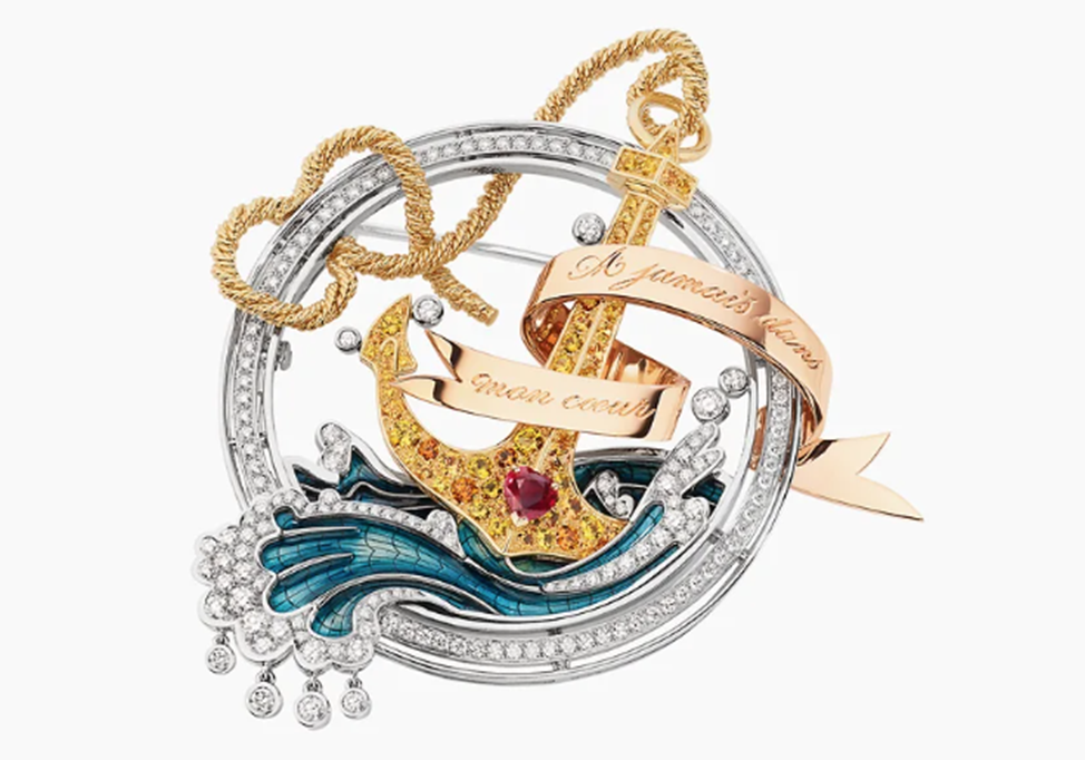 В парюре три броши. Двухмачтовая лодка, движимая неспешным попутным ветром, воплощает надпись на свернутом флаге «Любовь — это приключение». Вторая брошь – это романтические представления о морской или пиратской почте. В бутылке сверкает рубиновое сердце и просто взывает: «Не забывай меня». Третья брошь парюры представляет собой маяк, возвышающей в раме, напоминающей штурвал. Именно она раскрывает самое главное послание комплекта: «Любовь — мой проводник».