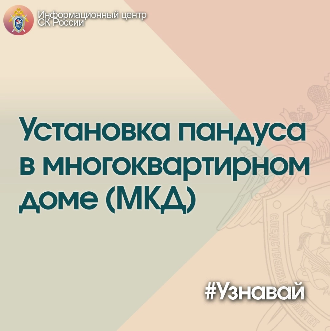 Установка пандуса в многоквартирном доме – в проекте #Узнавай 📁В этом проекте публикуются материалы с учетом волнующих заявителей вопросов, с которыми они чаще всего обращаются в Информационный центр Следственного комитета России. В комментариях под постом пишите по какой тематике хотели бы получить подробные разъяснения. Установка пандуса в многоквартирном доме (МКД) 🔸Управление МКД должно обеспечивать благоприятные и безопасные условия проживания граждан, а также надлежащее содержание общего имущества в МКД, что подразумевает обеспечение в том числе доступности пользования помещениями и иным имуществом, входящим в состав общего имущества собственников помещений в МКД 🔹Одним из способов установки пандуса в МКД без привлечения денежных средств собственников помещений и, который не требует проведения общего собрания собственников, является обращение в организацию, осуществляющую управление МКД. 🔸В зависимости от способа управления МКД (управляющей организацией, ТСЖ
