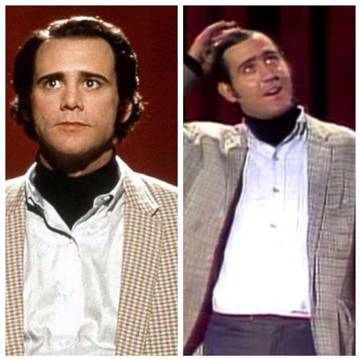 Джим Керри и Энди Кауфман Энди Кауфман - американский комик, который любил называть себя "человеком песни и танца". Когда Джим Керри узнал, что будет играть такого значимого в его жизни персонажа, первое, что пришло ему в голову, это вопрос: "А что бы в данный момент сделал Энди?". И именно с этого вопроса в голове у актера, как говорили потом его коллеги, начался "демоничечкий процесс".