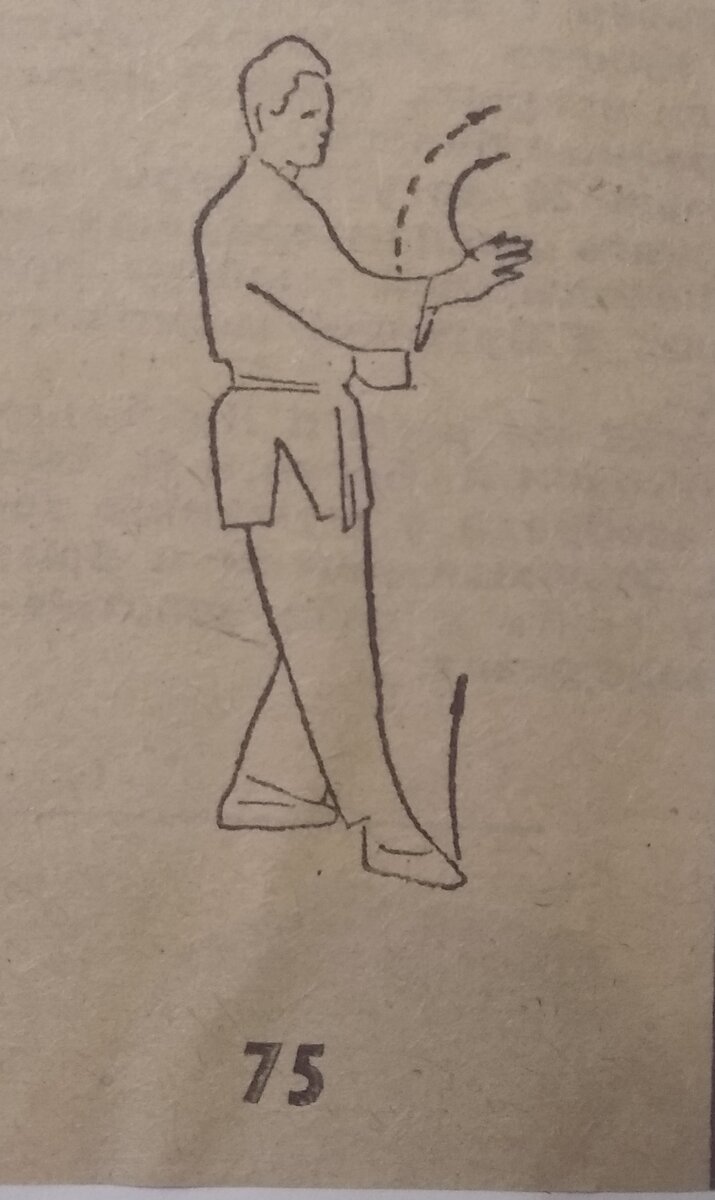 22. Представить ногу и бить. (75-80). Опустите левую ногу и сделайте ей шаг назад и влево, постепенно перенося массу тела на левую ногу. левая рука опускается ниже и подводится к груди (ладонь повёрнута вправо), а правая рука поднимается бедра и вытягивается на уровне груди направление северо-запада. Ладони обращены друг к другу, левая кисть расположена возле правого локтя, локти согнутые (75). Приставляя правую ногу к левой на носок, одновременно проведите обе руки по полукругу сверху вниз и справа налево. Сведите кисти рук перед туловищем, при этом правая ладонь накладывается на тыльную сторону левой кисти, и поднимите их перед собой на уровне шеи (76). Разводя руки на уровне плеч широко в стороны ладонями вперёд, поднимите правую ногу и выпрямите её полностью в направлении северо-запада; носок правой ноги оттянут и находится на уровне колена или чуть ниже (77). Опуская правую ногу, сделайте ней шаг назад и вправо, постепенно перенося массу тела на правую ног