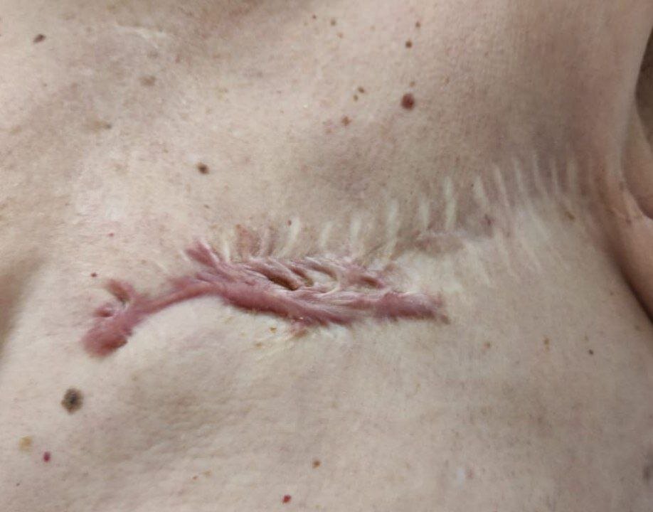 Разбираемся, это рецидив или келоидный рубец? Комплексное лечение в 2016 году в др. медицинском учреждении: Мастэктомия по Маддену, ХТ, ЛТ. На фото выше - через год после операции появились изменение в медиальном отделе п/о рубца. В течении этих лет изменения кожи стали больше и грубее.