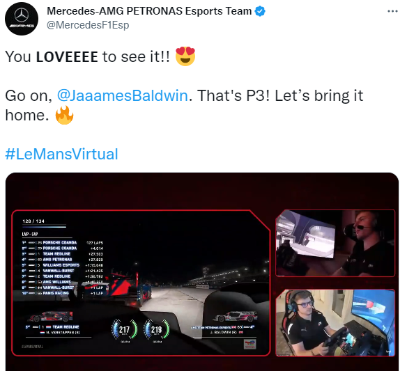 Поздравляем? Макс Ферстаппен повернут на гонках – звучит достаточно очевидно для описания двукратного чемпиона «Формулы-1», однако лидер «Ред Булл» реально проводит большую часть свободного времени за рулем реальной машины или симулятора. Например, в начале декабря – самый разгар межсезонья и главное окно для отпусков – Макс включился в виртуальные «500 миль Себринга» за команду Team Redline (Ферстаппен выступает за нее уже много лет). И ближе к концу заезда его достал пилот виртуального «Мерседеса» Джеймс Болдуин – и обогнал в битве за третье место! Этот редчайший случай превосходства немецкой команды над Максом в 2022-м тут же подсветили в соцсетях: «Вам понравится!» Основная команда «Мерседеса» тоже отрезала и запостила момент, в котором Ферстаппен вынужденно съехал с трека: «И прорывается Джеймс Болдуин!» (Макс – в отметках) Комментаторы заезда тут же отметили разную реакцию пилотов на момент: «Макс выглядит очень разочарованным. Это что, я вижу улыбку на лице Болдуина?» В итоге эк