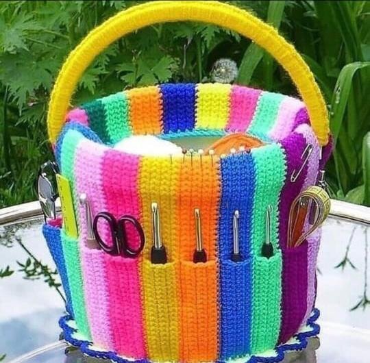 Творческий беспорядок. Всем известно такое выражение. Для одних – это приятные моменты рабочего процесса. Для других – обычные творческие моменты. Ни в коем случае никого не осуждаем! А может, просто им на глаза не попался такой милый органайзер? Известно всем, что любая вещь, сделанная своими руками, с любовью, в разы дороже. Органайзеров для вязания в магазине – на любой вкус и кошелек. Промышленный аналог, конечно, идеальный и супер качественный, но «холодный». Принесет ли он нам радость и позитив? Да и зачем тратить деньги? Создать приятную вещь совсем несложно самим. Простые вещи чаще всего самые удобные и функциональные. Что может быть проще, чем взять обычное продуктовое ведерко, обвязать его весёлыми остатками пряжи и украсить множеством кармашков. Или свяжите органайзер одного цвета, под стиль вашей гостиной или спальни. Добавьте уюта и порядка в ваш волшебный уголок рукоделия. Емкость ведерка выбирайте любую. Поменьше или побольше. А можно сделать органайзеры разной величи