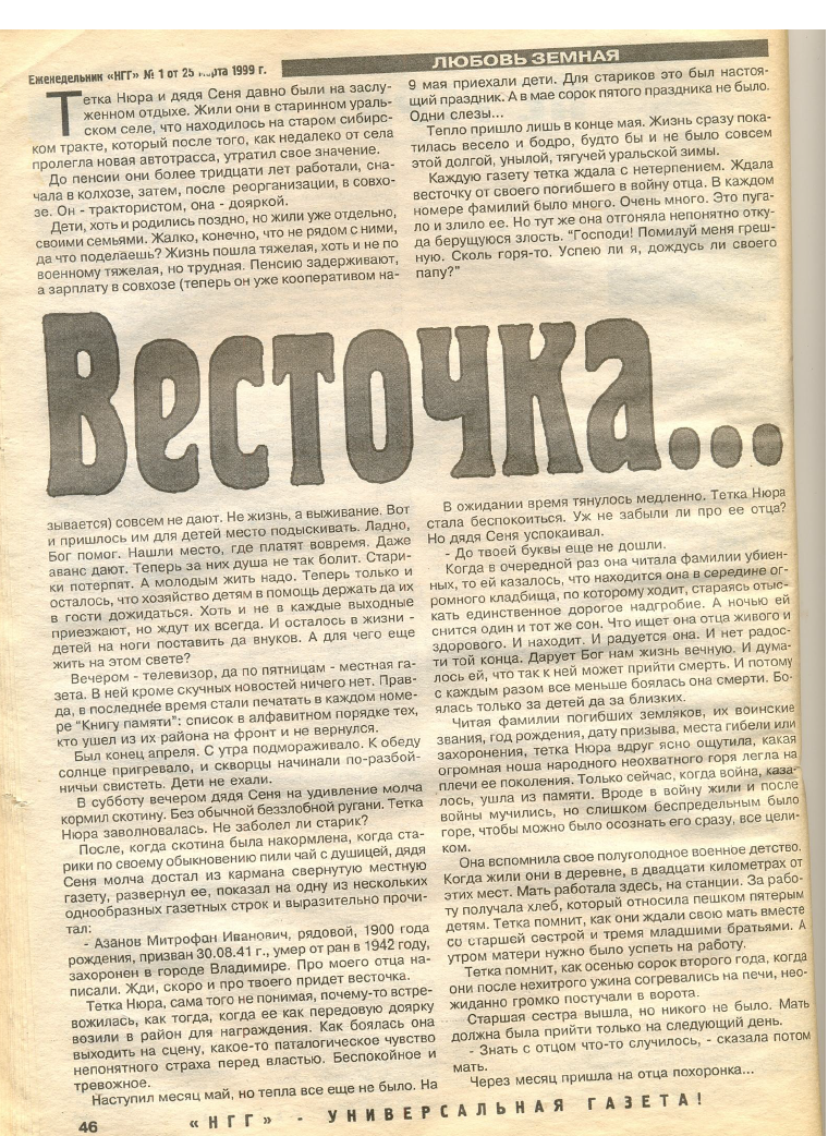 Это был первый номер "Нашей городской газеты". И я там был не в редакции, приехал из Ачитского района, которого никто не знает в городе Новоуральске, хотел до этого устроиться на работу в агрофирму "Уральская", но в первый же день меня выгнали с работы (был с офигенного похмелья). Потрм пришел домой, выспался и за вечер написал этот рассказ, который зрел во мне три года.