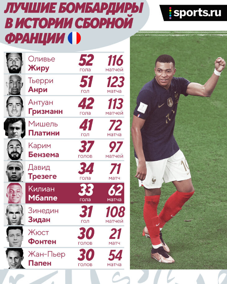 Суперзвезда. Франция на ЧМ-2022 бьет собственные бомбардирские рекорды. Тут и Жиру, который обошел Анри в топе бомбардиров сборной, и Килиан Мбаппе, который замахивается на исторические достижения. • Только вдумайтесь: Мбаппе уже забил за сборную больше Зидана (который играл за сборную 12 лет) и почти догнал Трезеге. Килиану осталось до рекорда Франции меньше, чем он уже забил – до Жиру всего 19 голов. Хотя Мбаппе провел практически в два раза меньше игр. • Среди футболистов, которые провели за сборную Франции 20+ матчей, у Мбаппе не так много конкурентов и по соотношению голы/матчи. В среднем у Килиана 0,52 гола за игру. Из футболистов послевоенного времени лучше статистика только у Жан-Пьера Папена (0,56), Мишеля Платини (0,57) и великого Жюста Фонтена (космические 1,43). У Фонтена 30 голов за 21 матч. • За сборную Франции больше Мбаппе до 24-летия не забил никто. У Трезеге – 19 мячей, у Бензема – 13, у Платини – 12, у Анри – 11, у Гризманна – 5. Просто для сравнения: у лучшего бомба