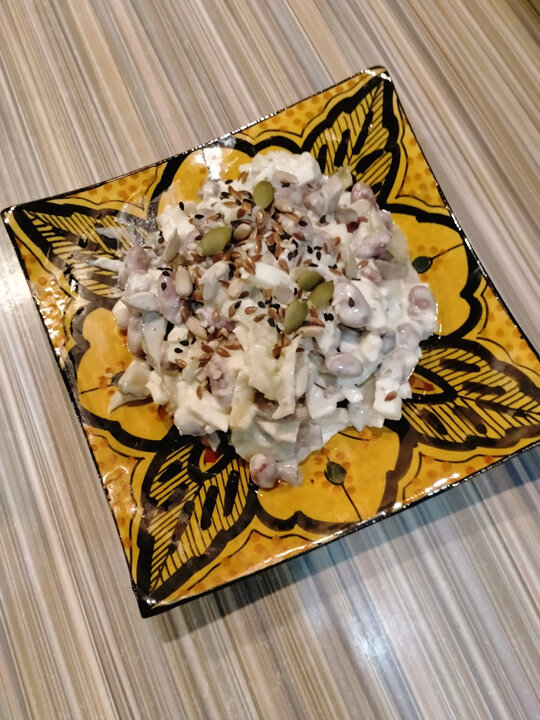 Сфантазировала себе нынче вот такой салатик. Отварную свиную печень нарезала тонкой соломкой. Таким же образом изрезала солёный огурец и стебель сельдерея. Добавила консервированную красную фасоль - готова её во всё добавлять :)) люблю очень. Несколько яиц вкрутую и буквально одна ложка майонеза - как связующее. Можно и масла растительного, но у меня какое-то невкусное сейчас. Для жарки годится, а в салат никак. Зелени в холодильнике не обнаружила. Посыпала семечками – кунжут + тыквенные + подсолнечные. Солить не стала - огурцы соленые. Больше общения и рецептов - в группе "Рецепты для диабетиков" в ВКонтакте! Рецепт на странице Автор рецепта – Марина Максимова