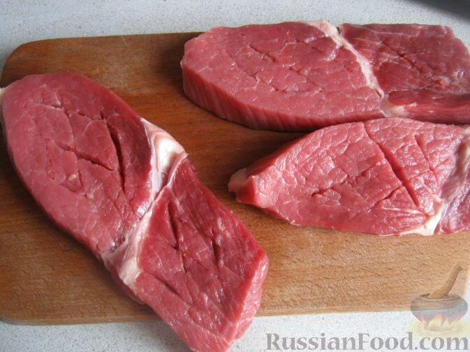Что может быть быстрее? Хороший стейк - это то, что нужно для хорошего обеда. Ингредиенты: Говядина (телятина), вырезка - 600 г Растительное масло - 6 ч.л Соль - по вкусу Черный перец молотый - по вкусу Сливочное масло - 20 г Шаг 1 Нагреть мясо до комнатной температуры естественным путем. Мясо вымыть тщательно. Нарезать мясо поперек волокон на куски толщиной 2,5-3 сантиметра. Сделать насечки острым ножом. Шаг 2 Смешать растительное масло с черным свежемолотым перцем.Одну сторону стейка смазать ароматным маслом. Внимание: мясо не солить. Шаг 3 Сильно разогреть сковороду. На раскаленную сковороду положить стейк смазанной стороной вниз и обжарить в течение 2-х минут. Смазать другую сторону стейка растительным маслом, перевернуть, жарить говяжий стейк еще 2 минуты до образования корочки. Шаг 4 Снять мясо со сковороды, смазать сливочным маслом, посолить. Говяжий стейк готов. Подать с картофельным пюре или овощным салатом. ПРИЯТНОГО АППЕТИТА!!!