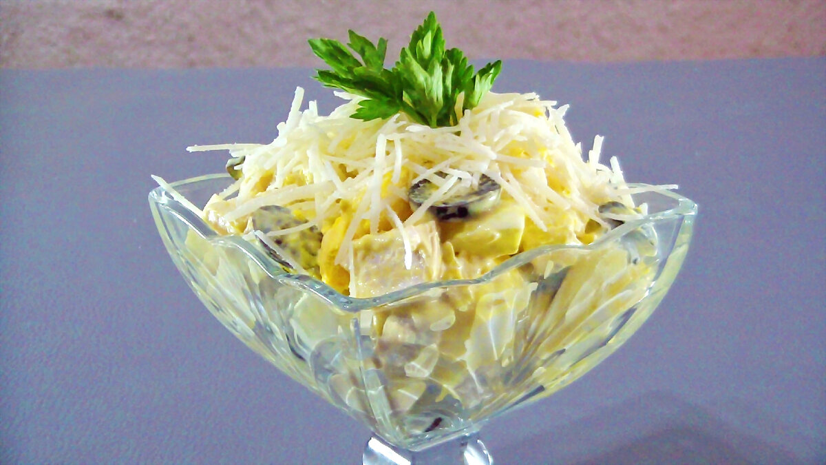 Практически на все праздники готовлю этот салат и он никогда никому не надоедает. Хочу поделиться и с вами рецептом салата "Наслаждение". Вроде бы простые продукты, но их сочетание действительно нежное и очень вкусное. Непременно сохраните себе рецепт и приготовьте к праздничному столу такой салат. Я просто уверен, что его оценят и гости и ваши родные. Интересно? Приглашаю к себе на кухню, где расскажу и покажу, как приготовить салат "Наслаждение". ВИДЕО РЕЦЕПТ: ПОШАГОВЫЙ РЕЦЕПТ С ФОТО: Заранее отваренное и охлажденное куриное филе нарезаю не очень мелким кубиком и отправляю в чашу. Маринованные шампиньоны нарезаю на 4 части и отжимаю из них маринад. Отправляю к мясу. Кольца консервированного ананаса нарезаю примерно на 8 частей и отжимаю от сока. Отправляю ананас в чашу. Черные оливки (маслины) без косточек нарезаю колечками и добавляю к остальным ингредиентам. Вареные яйца нарезаю не сильно мелко. Заправляю салат майонезом. Салат можно подать в общем салатнике или порционно в креманк