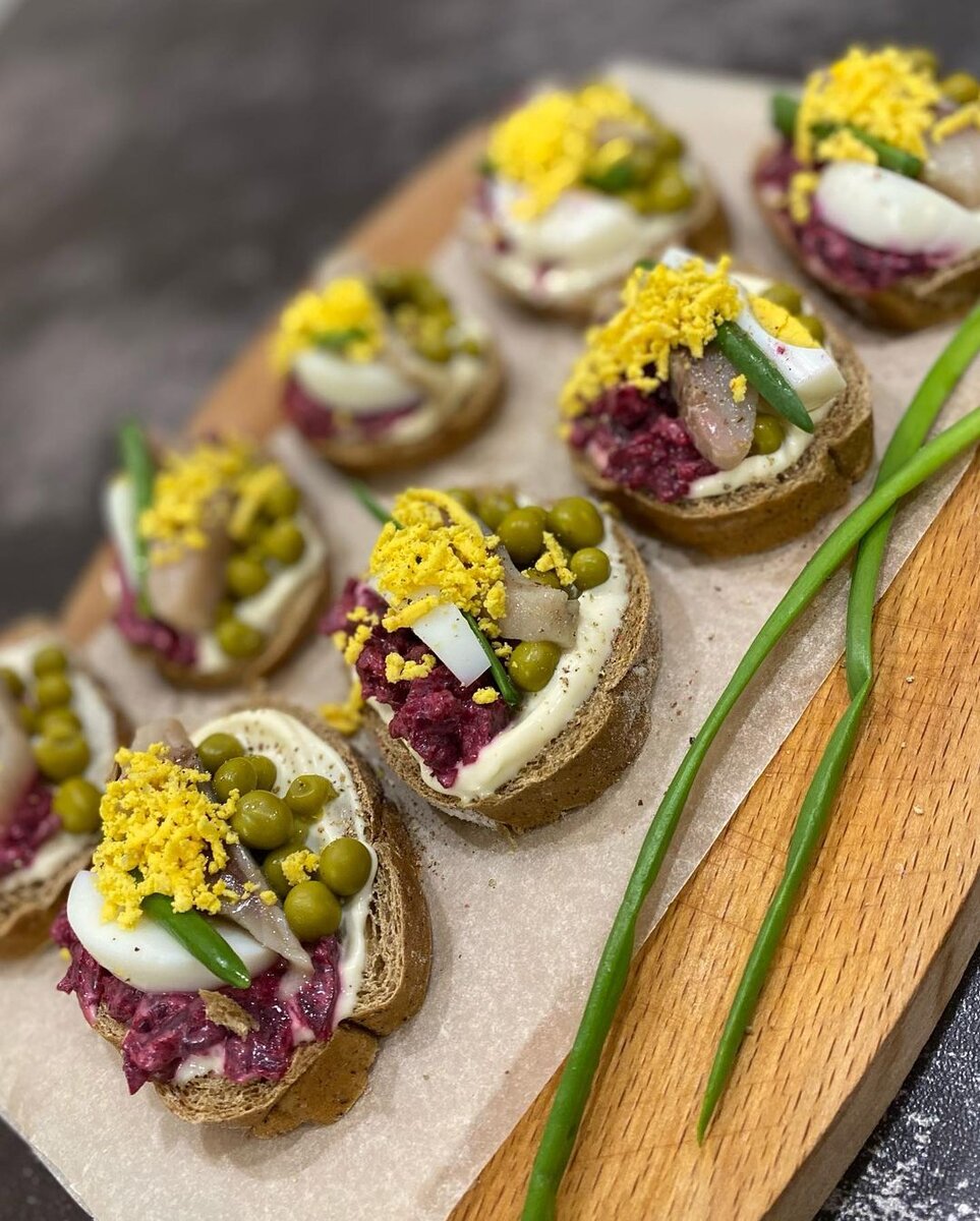 Отвариваем свеклу 20-30 минут, натираем на терке, добавляем майонез. Хорошо перемешиваем. ❗Буду рада вашей подписке 🔔 и вашему лайку 👍 Нарезать хлеб, смазать майонезом, поместить свеклу, кусочек яйца. Добавить лук, селедку, горошек и сверху посыпать натертым желтком. Колбасная и сырная нарезка с овощами Ингредиенты: