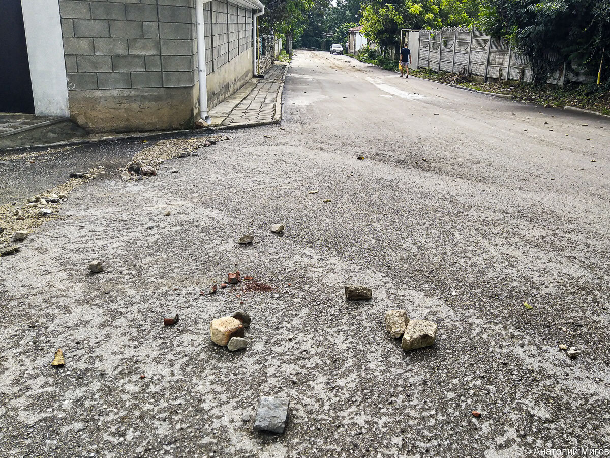 Год назад на нашей улице положили новый асфальт. Когда-то он здесь был, но к тому времени, когда мы здесь поселились, дорога возле дома была в сплошных ямах и колдобинах. Слёзы, а не дорога. Во всём нашем Старом Крыму такие дороги были. Поэтому мы и не надеялись, что доживём до светлого будущего. Однако, где-то года три назад, в городе появилась дорожная техника и улицы одна за другой начали приобретать человеческий вид. А потом случился праздник и на нашей улице. Но вот какая возникла проблем. Заасфальтировали только кусочек улицы, а большая часть, которая идет круто вверх, осталась убитой. И бегущая в дождь вода несла с собой камни. Так и раньше было. Но тогда эти булыжники вид нашей разбитой улицы не портили. А теперь на новом асфальте это стало как бельмо на глазу. Коммунальщики стали после каждого хорошего дождя подгонять трактор, который отвалом сгонял камни в кучу. Вот такая куча получалась после пары хороших дождей. А когда дождь так себе, то и камни были поменьше, плюс песок и