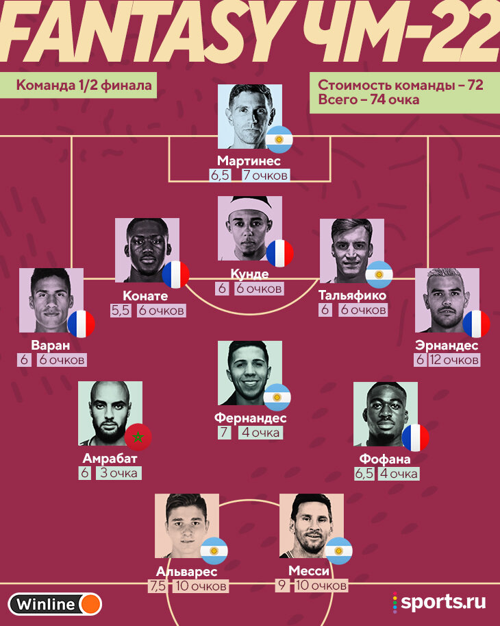 • Хулиан Альварес тоже в основе по стечению обстоятельств, во многом из-за травмы Лаутаро Мартинеса, но теперь по-настоящему блещет и делает разницу для тех, кто поверил в него в фэнтези: дубль в полуфинале – и шикарные десять очков.