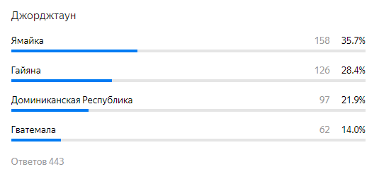 Вчера была статья со статистиков на буквы А, Б и В. Со столицами на Г, Е, З и И нет ничего интересного, поэтому мы начинаем с буквы Д Столицы на Д Правильный ответ здесь на втором месте. А столица Ямайки - Кингстон. Честно говоря, это меня удивило - ладно бы, выбрали Гватемалу, дак тут Ямайка... Столицы на К Я думала, что уже все выучили Канберру - оказывается, нет. 75 человек про нее не знают и перепутали ее с Веллингтоном Правильный ответ набрал всего на 5% больше неправильного. Удивлена тем, что столько людей знают какой-то непонятный город Кастри... Все Гвинеи получили много ответов, но правильный ответ все таки победил всех остальных! Малайзия и Индонезия, как мы знаем, находятся совсем рядом. Видимо, из-за этого сто человек немного ошиблись Скоро будет продолжение! Не пропустите by Dashuk