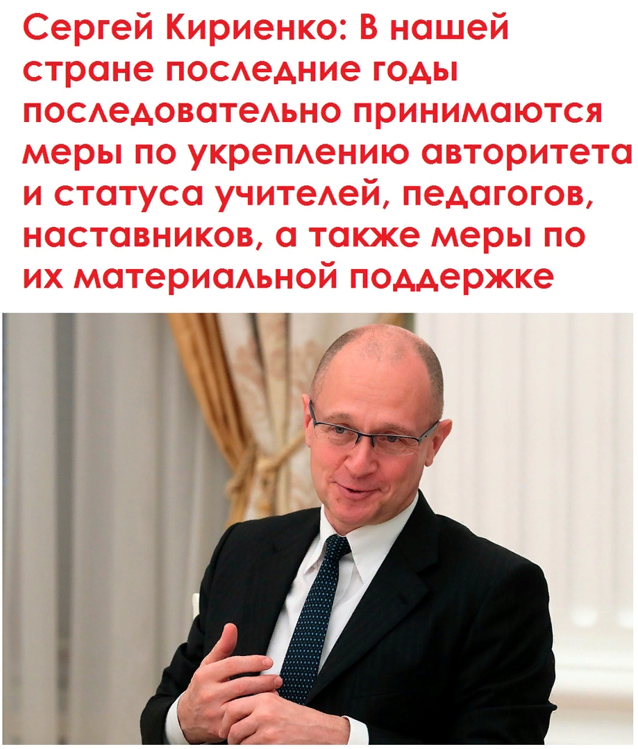 Сергей Кириенко: В нашей стране последние годы последовательно принимаются меры по укреплению авторитета и статуса учителей, педагогов, наставников, а также меры по их материальной поддержке.