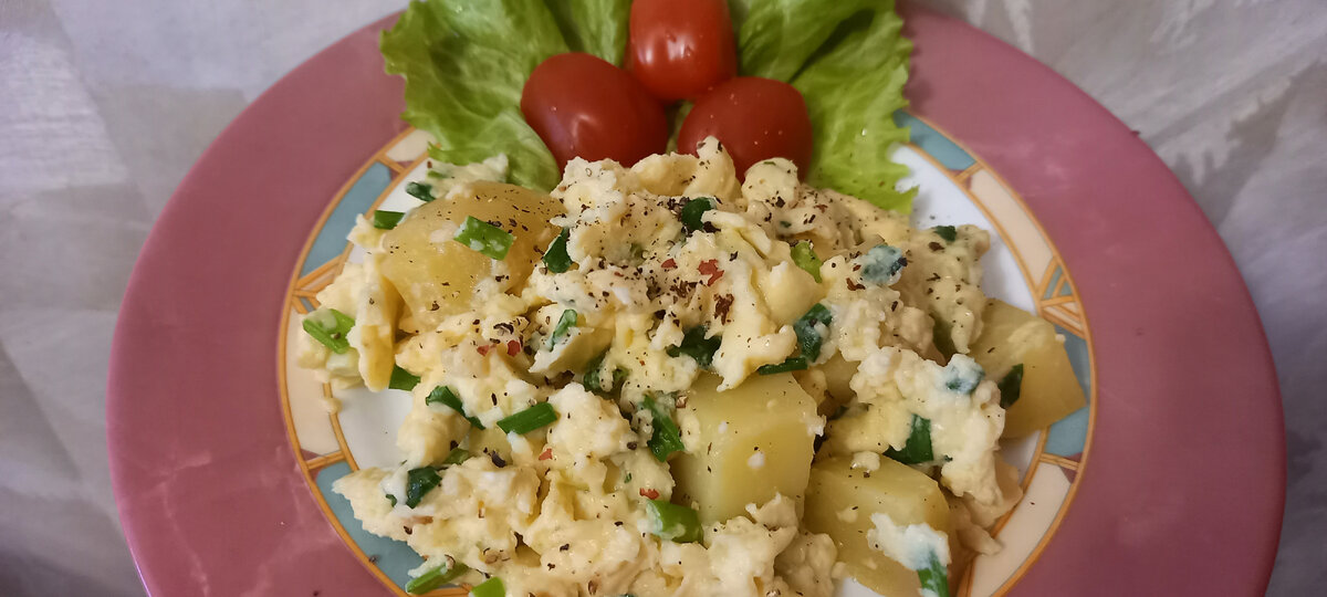 Чтобы приготовить такой омлет нам понадобятся: Яйца необходимо размешать, добавить молоко, специи. Лук порезать Картофель слегка обжарить на смеси растительного и сливочного масел Смешать лук с яйцами и вылить в сковороду к картофелю. Как только низ омлета схватится, начать перемешивать его лопаткой. Омлет готов. Можно завтракать. Сытно , вкусно и полезно! Приятного аппетита! Заходите в гости! Подписывайтесь на канал!😺