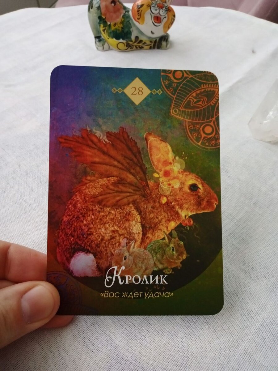 Послание оракула Вас манят цветущие Луга, и Кролик ведёт вас из тёмной норы на свет, зовёт вступить в прекрасную жизнь, наполненную дарами. Под землёй как будто безопасно, но чудеса с вами происходят тогда, когда Вы ходите наружу, чтобы рискнуть стать уязвимым и сотворить нечто новое. Вас призывает неизведанная жизнь. Но бояться нечего! Настало время продуктивности и плодотворности, время солнечной и живой энергии Кролика. Что бы вы не задумали такой момент - всё найдёт плодотворную почву. В со-творение с духом не бывает ошибок, так что позвольте новым идеям прорасти и помните: сейчас вас ждут удача и безграничные возможности. Послание защитника От вас требуется побыть уязвимым, даже если вы не чувствуете себя в безопасности. Притворитесь, будто верите, что всё должно сложиться, и вы увидите, что всё и правда будет хорошо. Созидание требует риска, так что в этот счастливый и плодотворный момент нужно прогнать страхи прочь и осознать, что настоящую безопасность можно найти, только погру