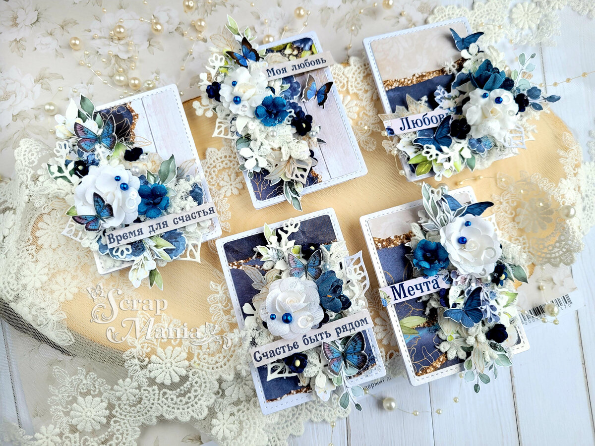 Всем привет! Сегодня с вами Elena Veres и моя новая серия АТС (Artist Trading Card) "Время для счастья". Те, кто знаком со мной поближе, знают, как я люблю этой миниатюрный формат скрап-работ. Попав в дизайн-команду, мне сразу захотелось сотворить серию АТС, но это желание ждало вдохновляющей коллекции и материалов. И вот она - великолепная, роскошная, невероятно прекрасная сапфирово-синяя коллекция "Королевский сапфир" с изысканными узорами, пышными цветами, белоснежными акцентами и россыпью золота! Главными материалами при выполнении этой серии стали лист с картинками для создания АТС и нож "АТС", которые непременно нужны каждому любителю карточек. С помощью ножа я врезала белую основу для карточек и информационную страничку АТС. Мне очень нравятся имитация строчки, скругленные углы и быстрота, с которой можно создавать бумажные основы. Карточки выполнены в сине-белой цветовой гамме, которая смотрится вполне органично среди зимних работ, создаваемых мастерицами в эти предпраздничны