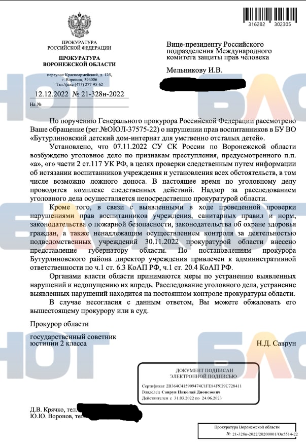 Выявлены нарушения санитарных норм, законодательства о пожарной безопасности и охране здоровья, а также, как выше сказано, нарушены права воспитанников учреждения. Трудно сказать, с хорошими новостями пришли мы к вам сегодня или с плохими. С одной стороны, здорово, что нарушения в Бутурлиновском интернате выявляются на официальном уровне, а не запинываются под стол из принципа «как бы чего не». С другой стороны – кошмары, о которых мы писали, мало-помалу подтверждаются. Так вечером 16 декабря со мной связался вице-президент российского подразделения Международного комитета защиты прав человека – Иван Мельников. Узнав о происходящем в Воронежской области, он еще в ноябре отправил запрос в Генеральную прокуратуру. К настоящему времени Ивану Владимировичу пришел ответ за подписью областного прокурора Николая Савруна. — По поручению Генерального прокурора рассмотрено Ваше обращение <…>. В связи с выявленными в ходе проведенной проверки нарушениями прав воспитанников учреждения, санитарных