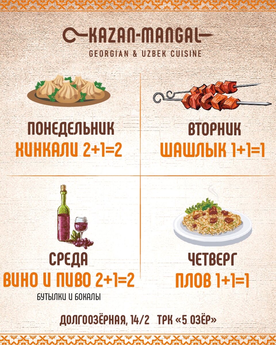 KAZAN-MANGAL — новый ресторан грузинской и узбекской кухни на Долгоозёрной улице, 14. Концепция ресторана – радовать гостей своим гостеприимством и любимыми блюдами восточной кухни! В меню представлено все, чем богата кухня Кавказа и Азии – сочные хинкали и манты; ароматные шашлыки и люля; традиционные салаты и холодные закуски; пряные супы и, конечно, настоящий узбекский плов с бараниной и барбарисом. Настоящая гордость KAZAN-MANGAL – выпечка и десерты. Здесь готовят не только любимые многими хачапури, но и самсу, кутабы, чебуреки и несколько видов лаваша. Для сладкоежек есть традиционные восточные сладости – пахлава, згапари с черносливом и мацони с медом и орехами. Барная карта обширна и многообразна: грузинские вина и компоты соседствуют с аутентичными сортами пива, чачи и лимонадов. В интерьере сочетаются восточная классика и современные детали: мягкие подушки с традиционным орнаментом и имитация колонн из канатного жгута, яркие плетеные тарелки и неотесанный камень с граф